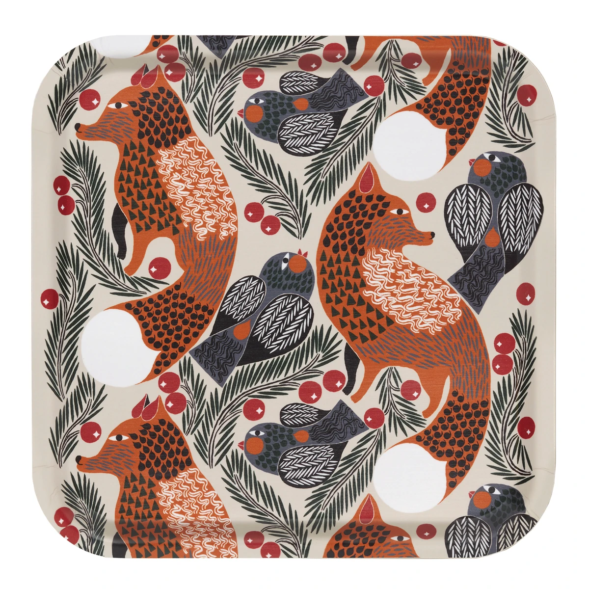 This festive and folkloric print by Aino-Maija Metsola is called Ketunmarja, or “Fox Berry.” As the name suggests, it depicts a whimsical woodland scene of foxes and birds among juicy berries. Here, it patterns a Marimekko serving tray in shades of orange-brown, cranberry red, forest green, grey, black, and white on a greige backdrop. Made from laminated birch plywood, the tray is sturdy yet lightweight and able to be cleaned in the dishwasher. Use it to serve small bites and drinks or display it as an artful coffee table catch-all.