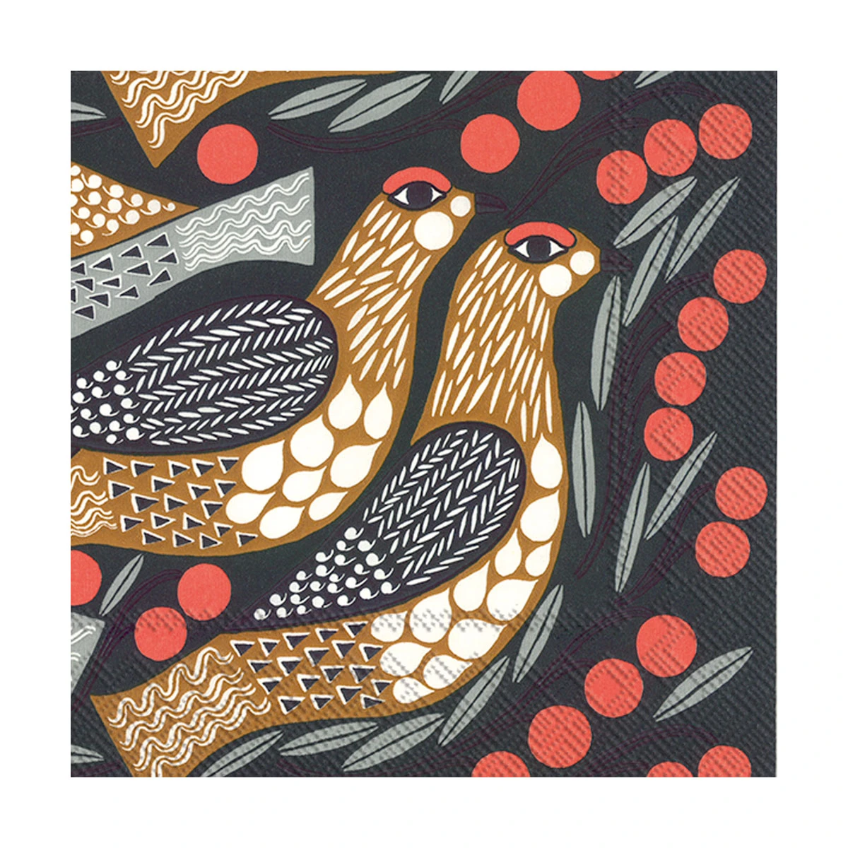 The Ptarmigan (Kiiruna) is a type of grouse bird, which is depicted in folklore style on these stunning Marimekko paper napkins. Enjoy the convenience in good conscience as these napkins are printed on eco-friendly recycled tissue with water-based dyes, and are biodegradable.