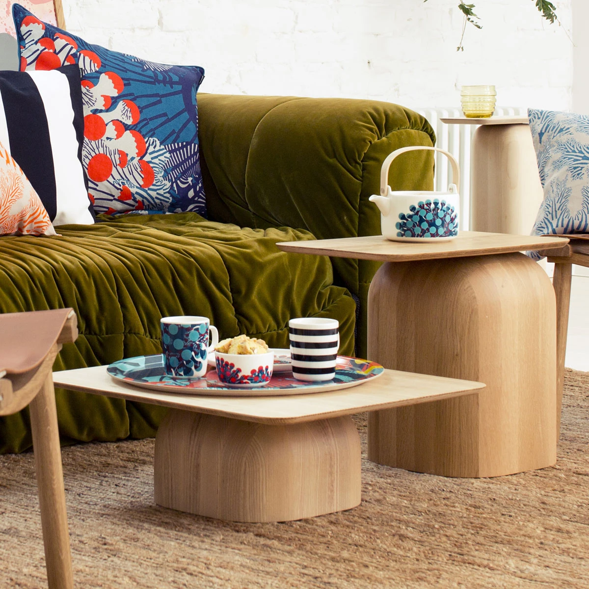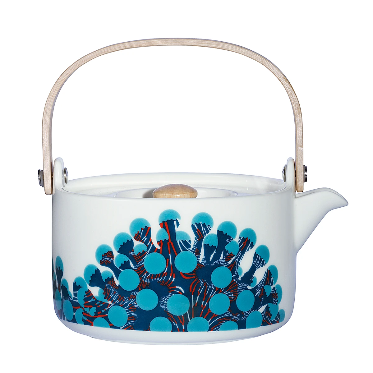 Spring teatime just got a little more lively. The ocean contains 99% of the planet’s living space, yet less than 10% of it has been explored. After getting a glimpse into this mysterious marine life through scuba diving, Kustaa Saksi made Merivuokka (Sea Anemone): his debut design with Marimekko and ode to the ocean floor’s flora and fauna. Vibrant hues of coral, turquoise and petrol capture the colorful community which settles on the seascape, while swaying lines and organic shapes mimic the movement of living reefs. This chic teapot is made of vitreous porcelain and includes a matching porcelain tea strainer.