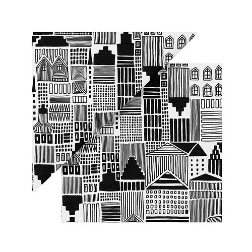 Add some urban flair to your next luncheon with the Marimekko Onnea Etsimässä White/Black Lunch Napkins. Meaning “Looking for Happiness” in Finnish, this pattern by Maija Louekari cleverly captures the architectural beauty of big city life. Printed with non-toxic, water-based colors on recycled tissue, these 100% biodegradable napkins are a more eco-friendly way to enjoy the convenience of disposable napkins. Incorporate this pattern at your next party or while enjoying a casual lunch with your family; however this pack of 20 stylish squares is used, it’s bound to make mealtime a little more memorable.