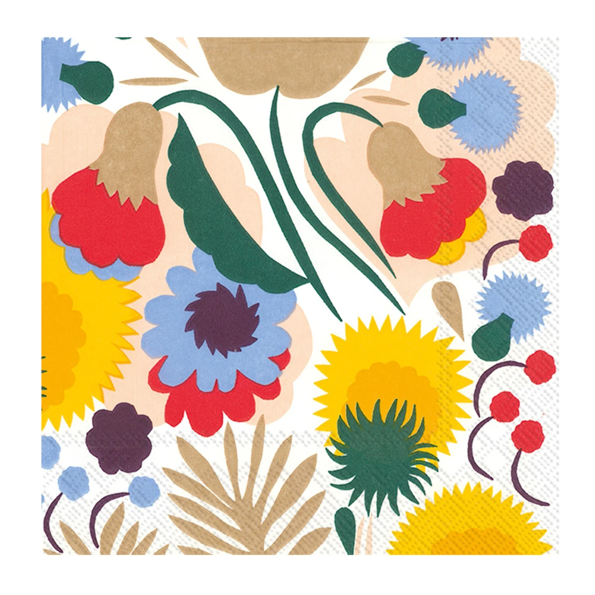 Add a splash of fun playful color to your favorite setting with the Marimekko Pikkukellukka Lunch Napkins. In hues of red, blue, yellow, green, and brown on a white back splash, these napkins are printed with non-toxic, water-based colors on recycled tissue, these 100% biodegradable napkins are a more eco-friendly way to enjoy the convenience of disposable napkins. Whether you’re enjoying drinks on the patio during a summer afternoon or trying to add cheer to a dreary day, these colorful little squares will make the moment cheerful.