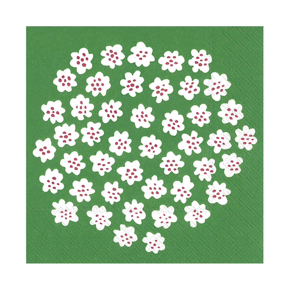 Set the table with Annika Rimala’s classic 1964 Puketti (Bouquet) print. White blossoms with maroon dotted centers decorate a green backdrop. Enjoy the convenience in good conscience as these napkins are printed on eco-friendly recycled tissue with water-based dyes, and are biodegradable. Whether stacked up, set with flatware, or placed under wine glasses the Marimekko Puketti Green Cocktail Napkins will add a pleasant touch to any place setting.