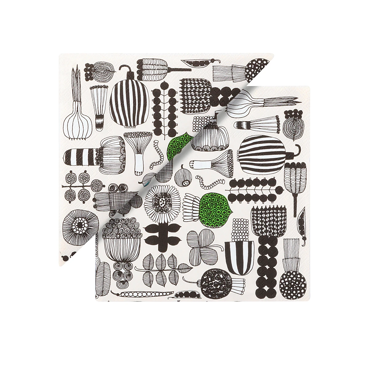 Set the table with fresh garden veggies and Maija Louekari’s Puutarhurin Parhaat (gardener’s best) print. Black and white doodle-style vegetables and blooms are accented with pops of blue and green, all contrasting a creamy grey backdrop. Enjoy the convenience in good conscience as these napkins are printed on eco-friendly recycled tissue with water-based dyes, and are biodegradable. Whether stacked up or set with flatware, the Marimekko Puutarhurin Parhaat Lunch Napkins will add a friendly finishing touch to any place setting.