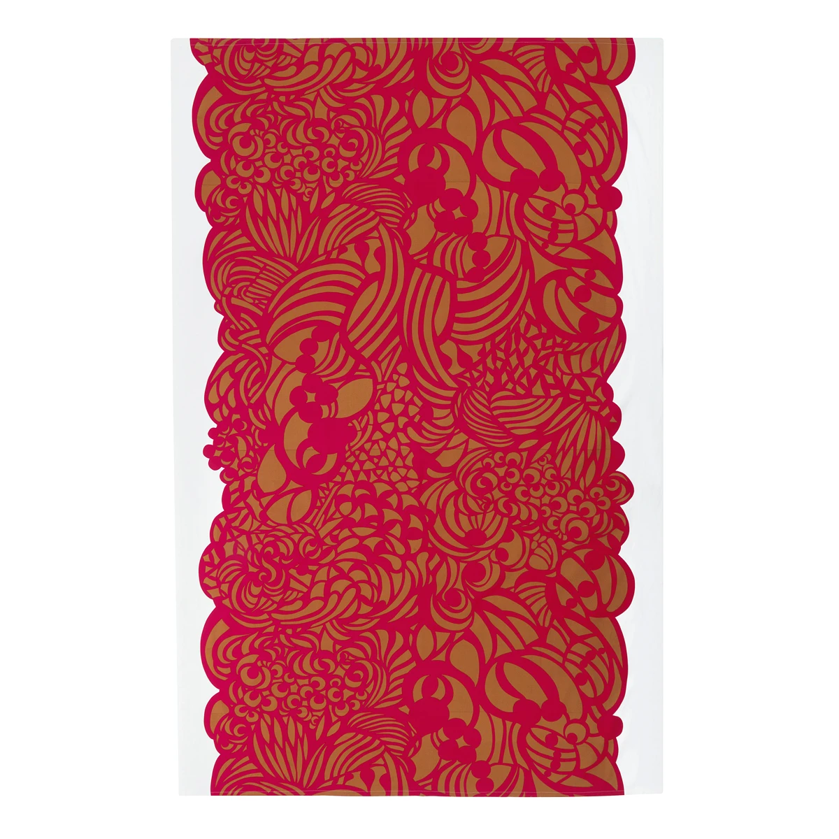 Drape the Marimekko Raakel Ochre / Red Tablecloth across your table and set the mood for a memorable evening. Elegant botanicals designed by Paavo Halonen on smooth cotton achieve the look of both sophistication and coziness at once. An bold colorway of ochre and red brings a festive feeling to the table.