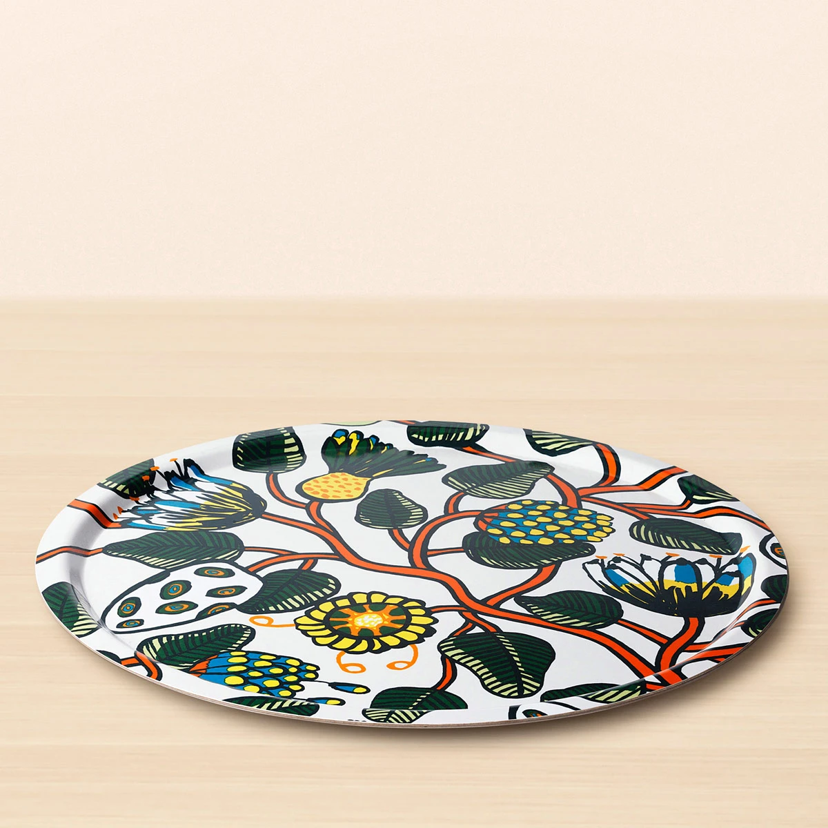 Serve a crowd in smart style with the Marimekko Tiara Round Tray. The laminated plywood is food-safe, shatterproof and waterproof. Boldly colored, Erja Hirvi’s Tiara pattern also allows this tray to serve as tabletop art and a place for produce, magazines or other odds and ends.