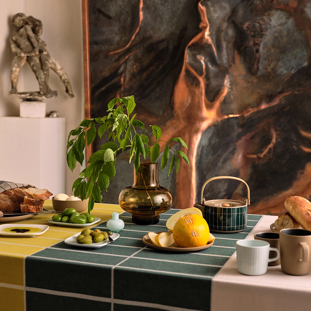Distinctly inspired by Japanese design, Sami Ruotsalainen integrates clean lines and natural wood with Armi Ratia’s simplistic Tiiliskivi (Brick) pattern in green and beige. Lift the top and you will find a removable tea strainer for brewing the perfect cup every time.