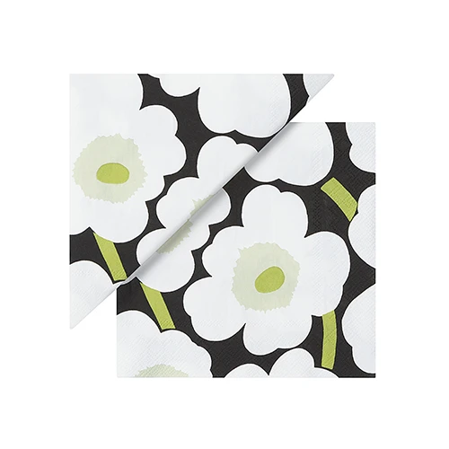 Create a vibrant table setting with Marimekko’s Unikko Black/White/Green lunch napkins, displaying Maija Isola’s 1960’s popular flower pattern. The cocktail napkins accent any buffet or dining table with modern style which, is sure to get you complimented. Printed with non-toxic, water-based colors on recycled tissue, these 100% biodegradable napkins are a more eco-friendly way to enjoy the convenience of disposable napkins.