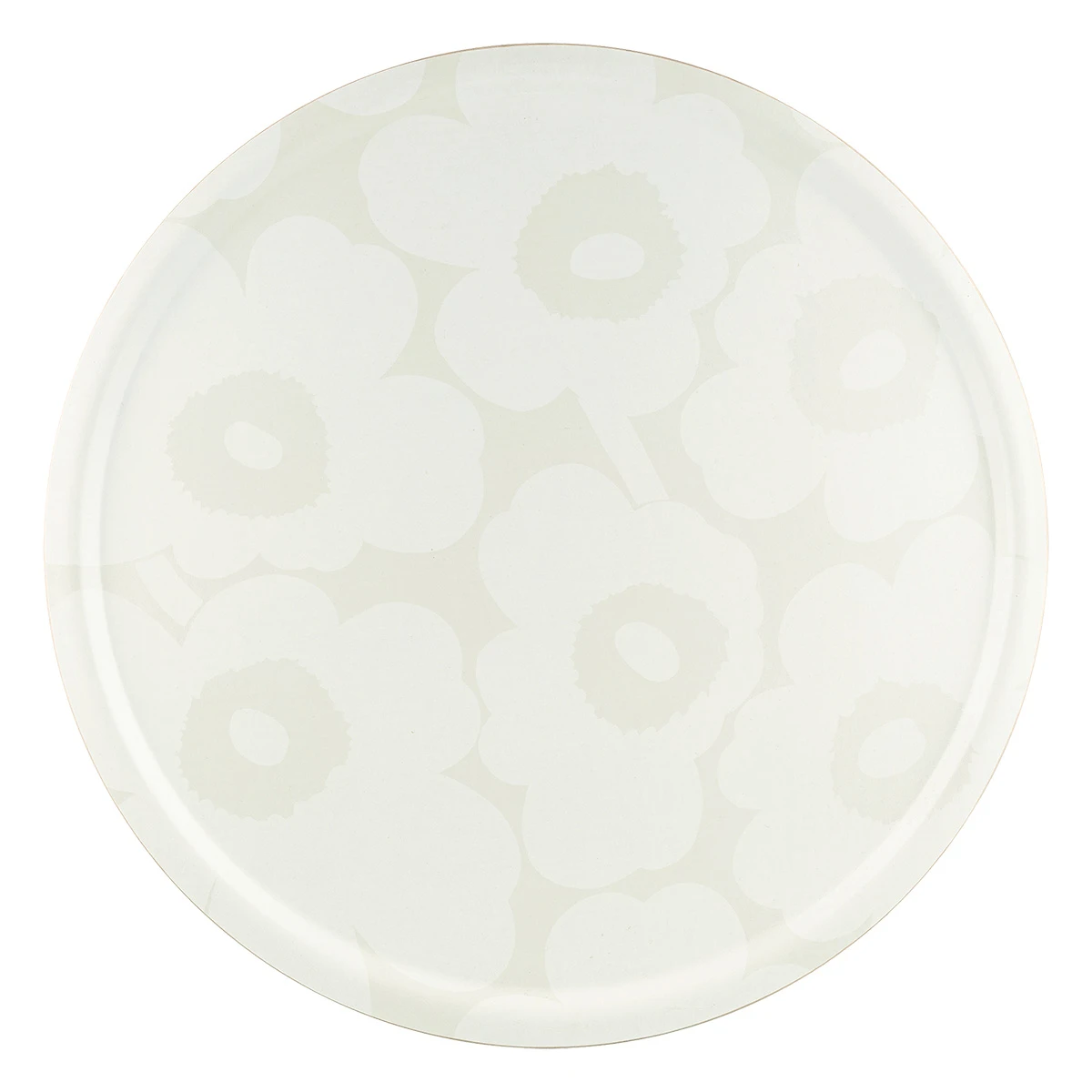 Adorned with Maija Isola’s joyful poppies, this large Marimekko tray features a simple and subtle rendition of the classic Unikko print in a white-on-white colorway. This versatile and handy tool will be perfect for serving drinks or dishes, containing clutter on a table or vanity, or as additional table space in the kitchen. This Marimekko Unikko tray is made of laminated poplar plywood, and the lightweight material is durable and easy to move back and forth. The 25.5″ (65 cm) tray is compatible with Marimekko’s oak tray stand to create a convenient lifted table for additional dining where needed.