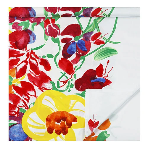 Like a scene from a sweet, summertime dream, dine atop a glorious garden of lush leaves and beautiful blossoms with the Marimekko Ursula White/Multi Short Tablecloth. Sweet peas, poppies and peppergrass are among the beauties depicted in the wonderful, watercolor-like world of Paavo Halonen’s Ursula pattern. Drape this print atop the kitchen, dining room, or patio table for a mess-free meal, as this 100% cotton table linen is conveniently machine-washable. Wherever this practical and picturesque piece is used, it will only enhance the scrumptious spread.
