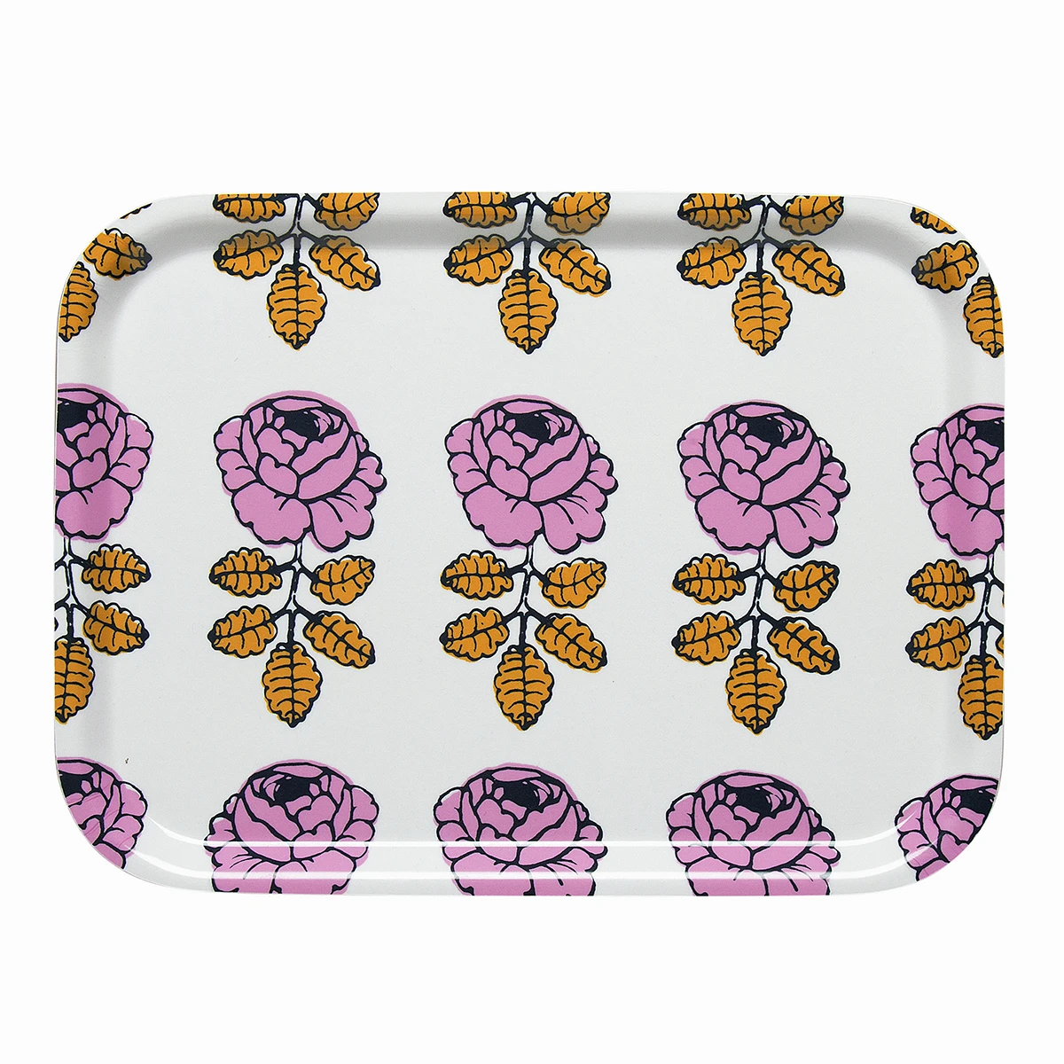 Pioneering designer Maija Isola created the Vihkiruusu (Wedding Rose) print in 1964, and it’s just as lovely today. The repeating blossoms are sweet yet eye-catching in hues of fuchsia and gold on a soft ivory backdrop. Here, the printed fabric is pressed onto a plywood tray and laminated for a variety of uses. Sturdy yet lightweight, it can be used for small bites and drinks or serve as a vanity or coffee table catch-all.
